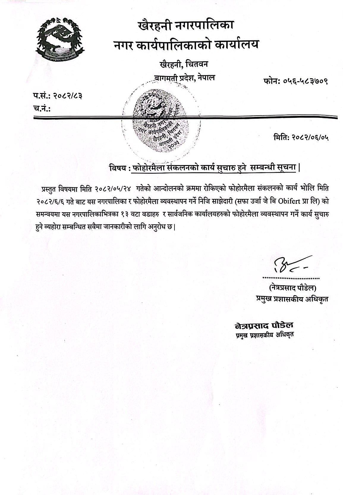 Home » फोहोरमैला संकलनको कार्य सुचारु हुने सम्बन्धी सूचना |