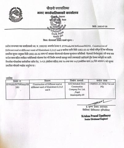 बोलपत्र(07/Works/NCB/Kmun/082/83)को आशय पत्रको सूचना ।