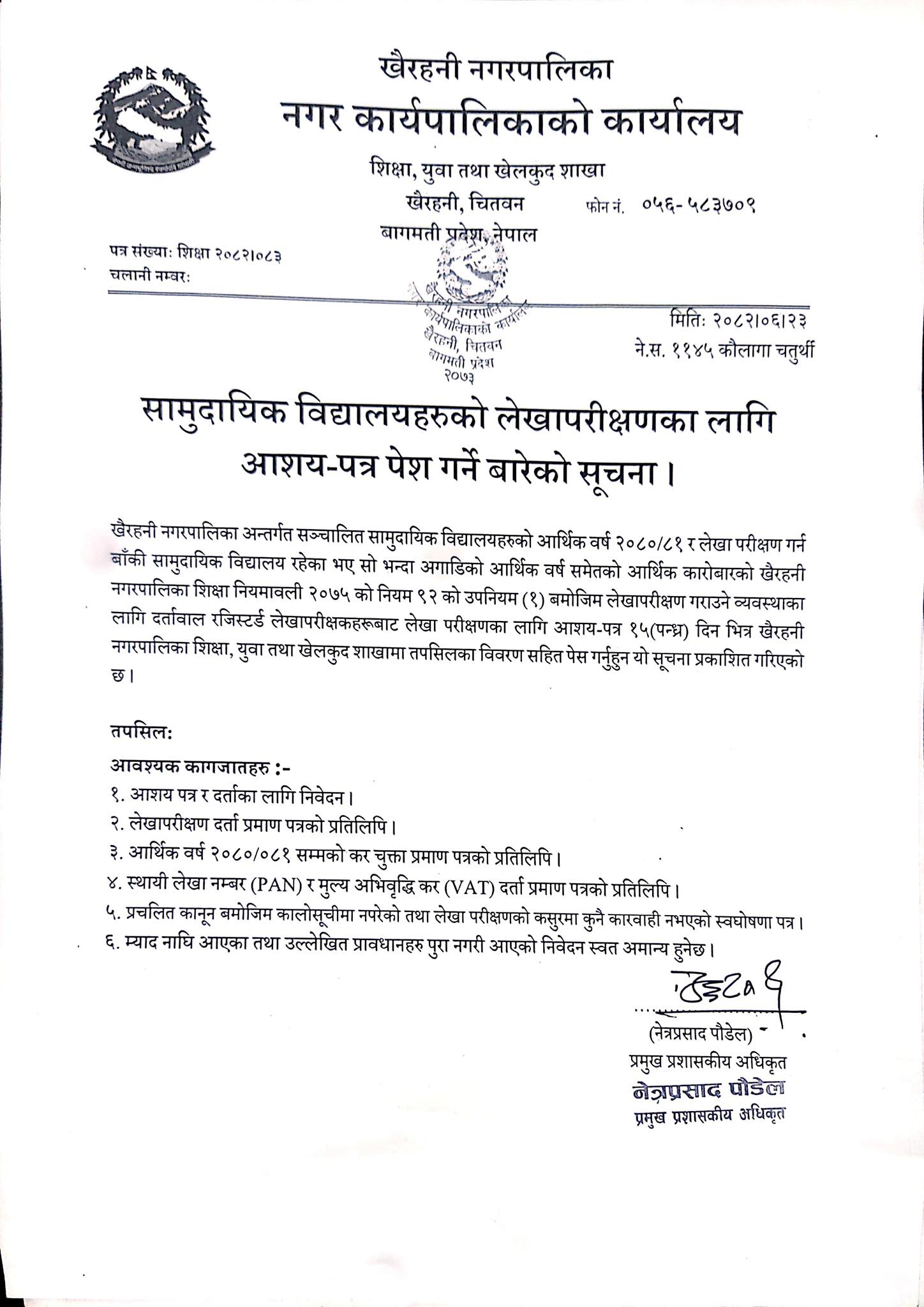 » सामुदायिक विद्यालयहरुको लेखापरीक्षणका लागि आशय-पत्र पेश गर्ने बारेको सूचना ।