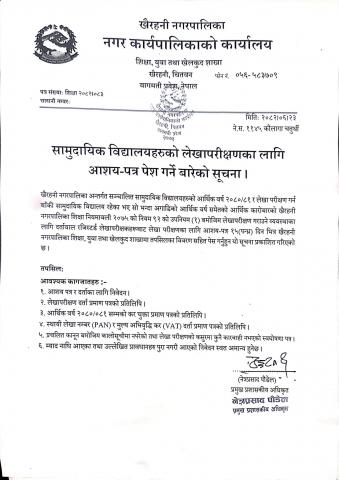 सामुदायिक विद्यालयहरुको लेखापरीक्षणका लागि आशय-पत्र पेश गर्ने बारेको सूचना ।