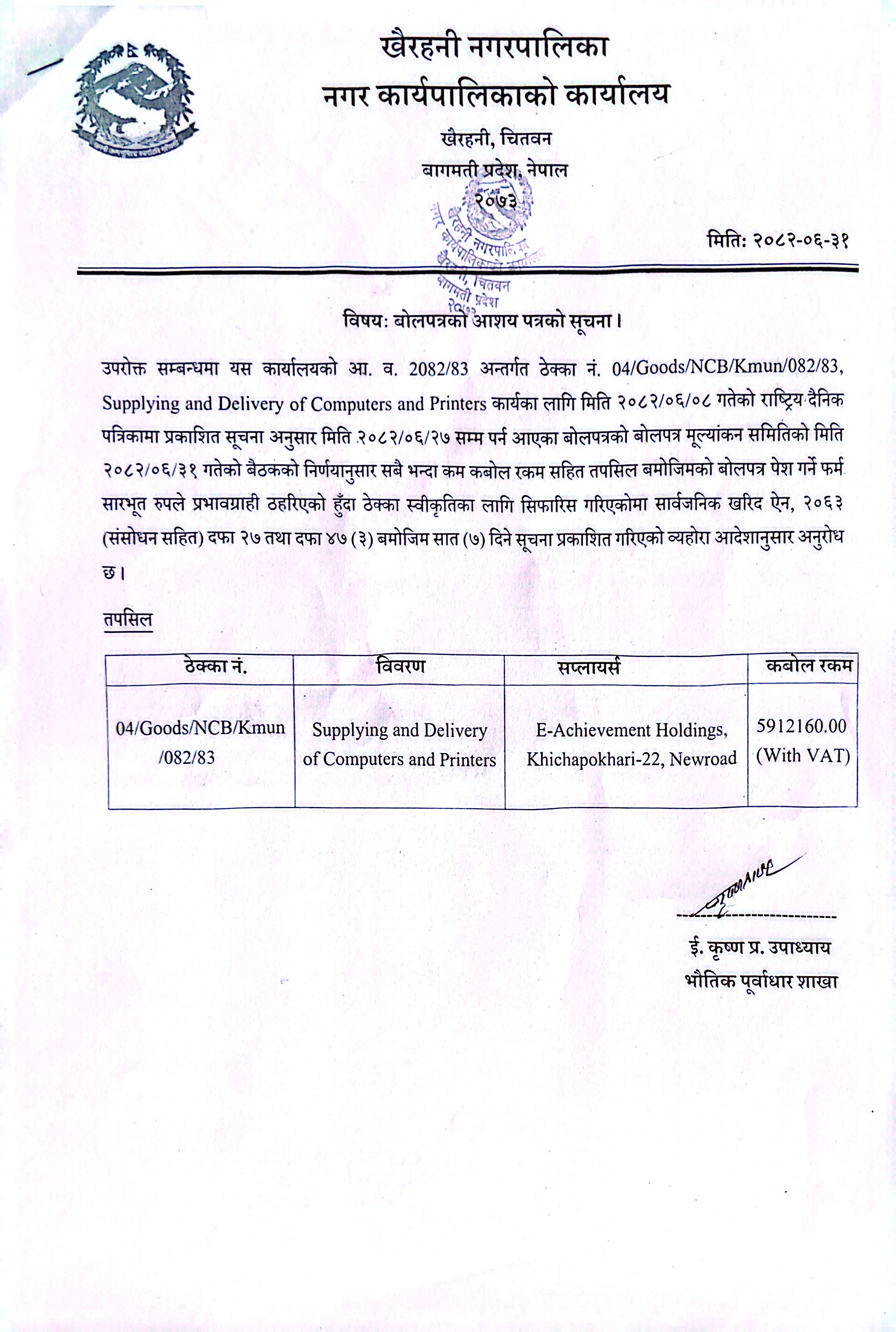 बोलपत्र(03/SQ/Goods/KhairahaniMun/2082/83)को आशय पत्रको सूचना ।