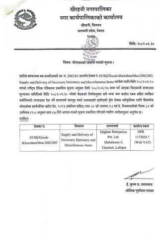 बोलपत्र(03/SQ/Goods/KhairahaniMun/2082/83)को आशय पत्रको सूचना ।