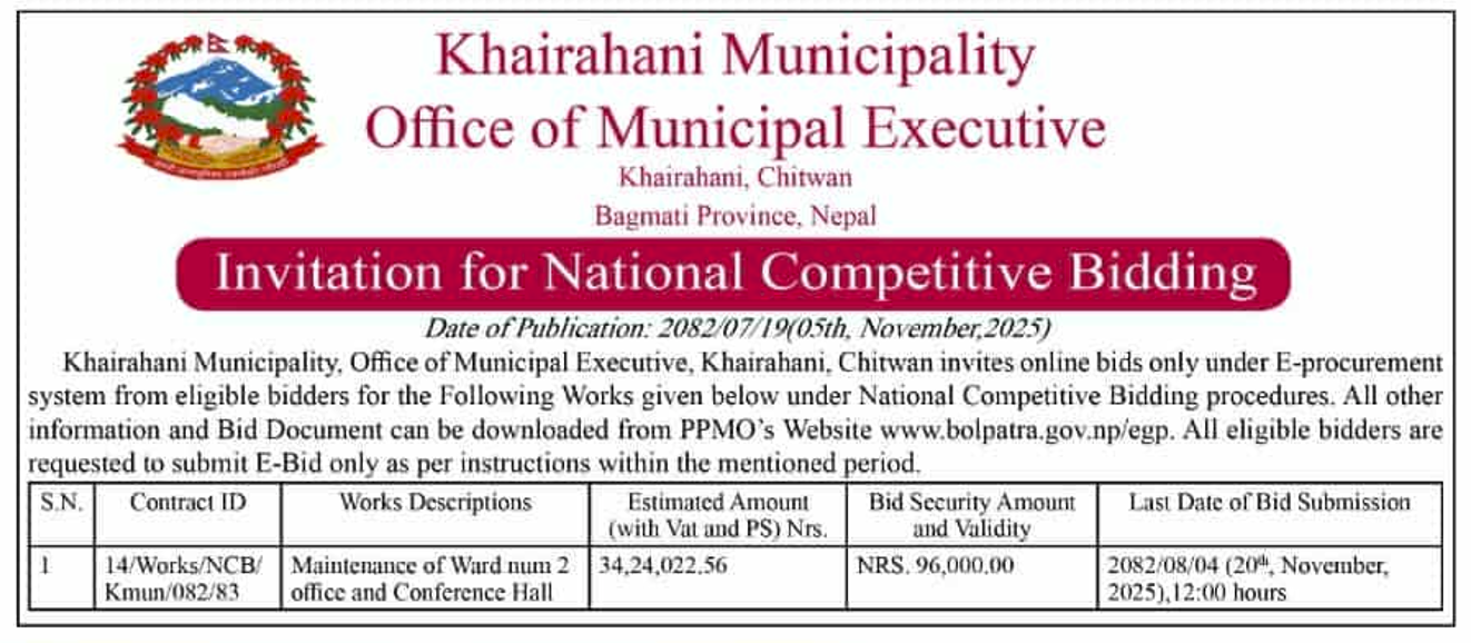 बोलपत्र(05/Works/NCB/Kmun/082/83)को आशय पत्रको सूचना ।