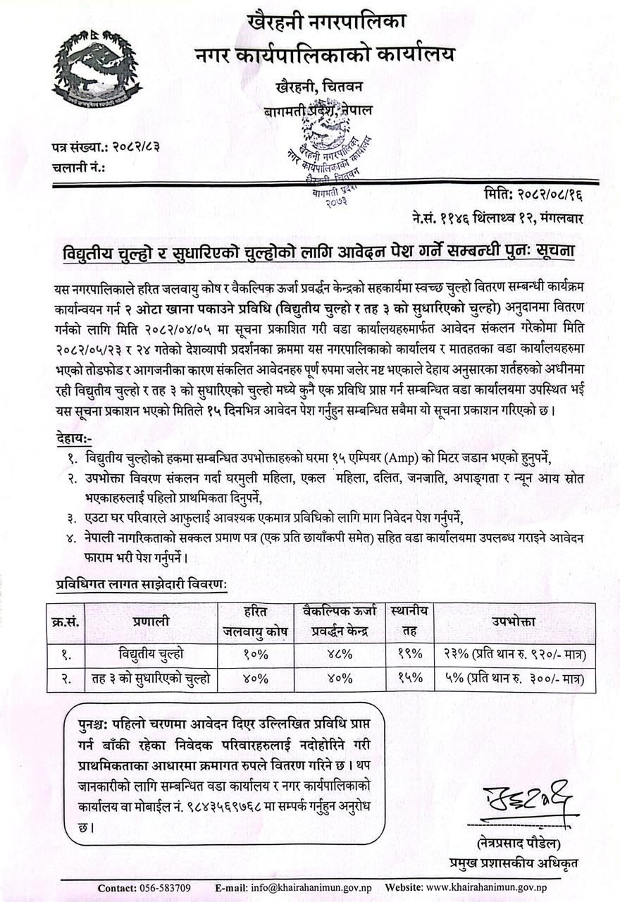 विद्युतीय चुल्हो र सुधारिएको चुल्होको लागि आवेदन पेश गर्ने सम्बन्धी पुनः सूचना