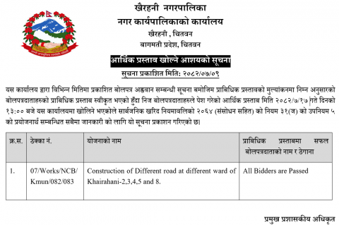 आर्थिक प्रस्ताव खोल्ने आशयको सूचना !!(07/Works/NCB/Kmun/082/83)