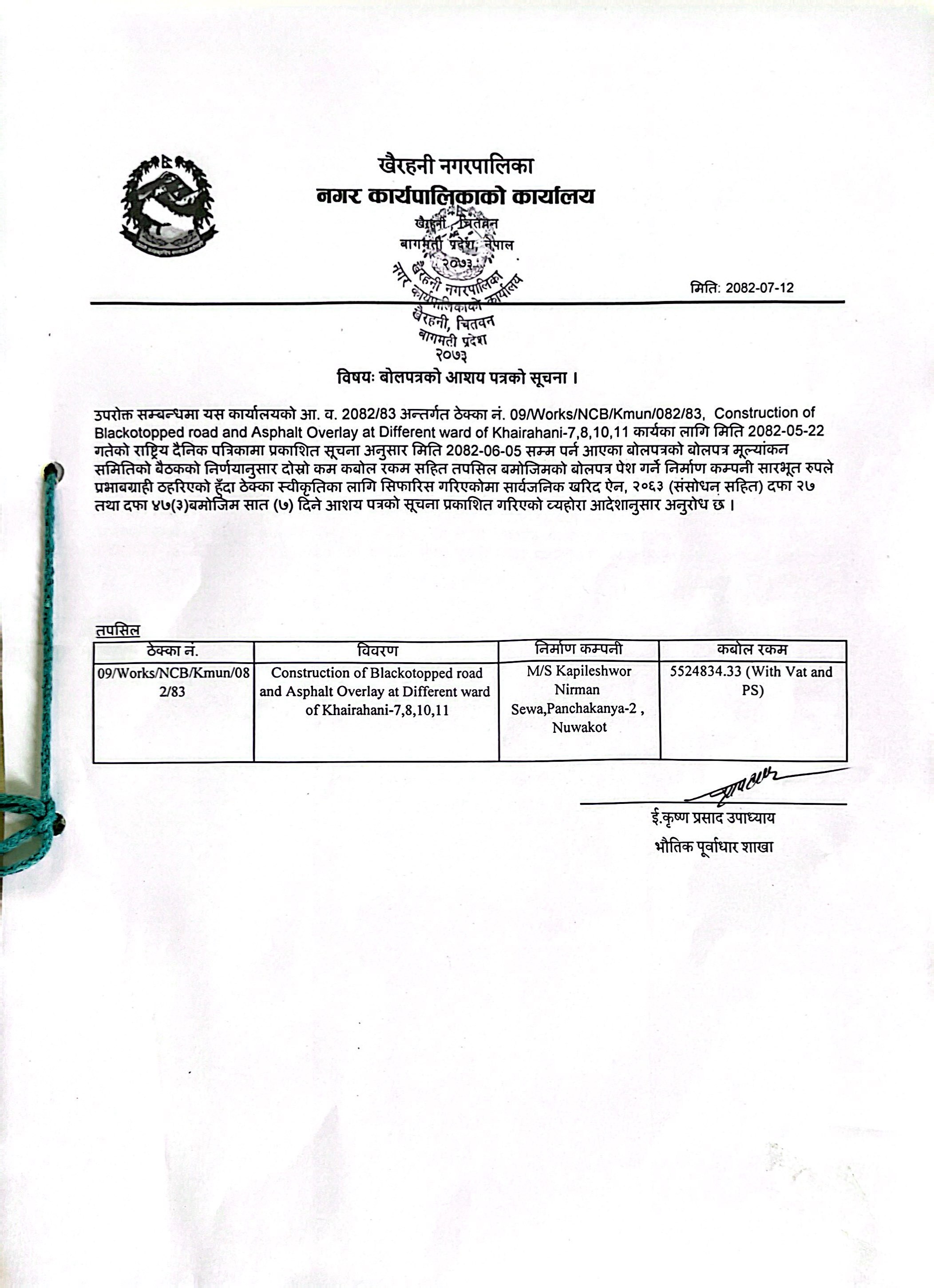 बोलपत्र(03/SQ/Goods/KhairahaniMun/2082/83)को आशय पत्रको सूचना ।