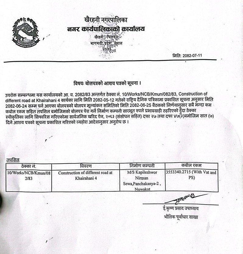 बोलपत्र(03/SQ/Goods/KhairahaniMun/2082/83)को आशय पत्रको सूचना ।