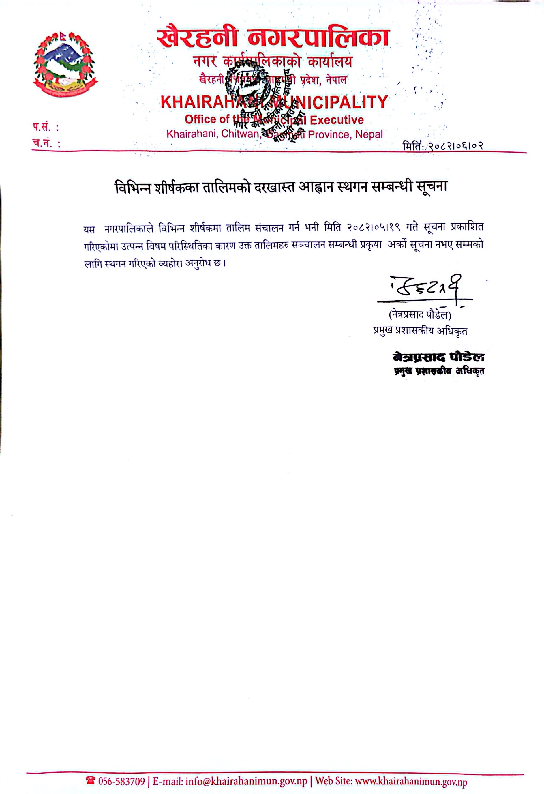 विभिन्न शीर्षकका तालिमको दरखास्त आह्वान स्थगन सम्बन्धी सूचना !!